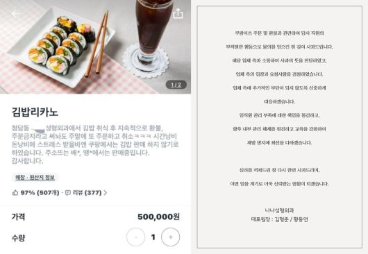 앞서 지난 20일 소셜 미디어(SNS)를 중심으로 올라온 사진에는 '김밥리카노(김밥 1줄+라지 커피 1잔)' 메뉴 가격이 50만 원으로 책정되어 있는 모습이 담겼다.