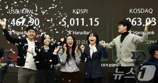 (서울=뉴스1) 최지환 기자 = 22일 오전 서울 중구 하나은행 본점 딜링룸 전광판에 코스피 지수가 장중 5000p를 넘자 직원들이 환호하고 있다. 2026.1.22/뉴스1choipix@news1.krCopyright ⓒ 뉴스1. All rights reserved. 무단 전재 및 재배포, AI학습 이용 금지.