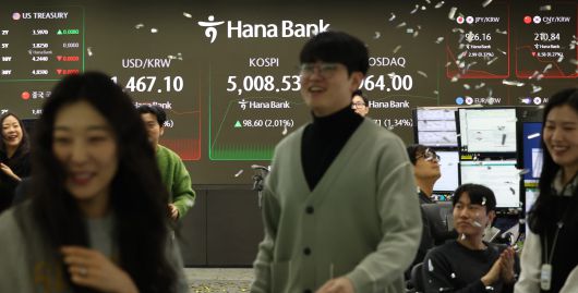 코스피가 장중 5,000을 넘어선 가운데 22일 오전 서울 중구 하나은행 딜링룸에서 딜러들이 기뻐하고 있다. /연합뉴스 |
