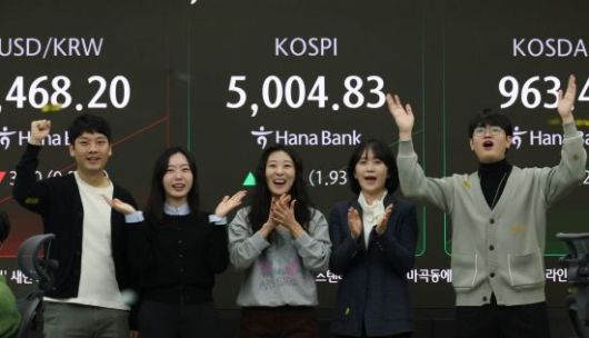 코스피가 꿈의 지수 '5000'을 돌파한 22일 서울 중구 하나은행 딜링룸에서 직원들이 기뻐하며 박수를 치고 있다.