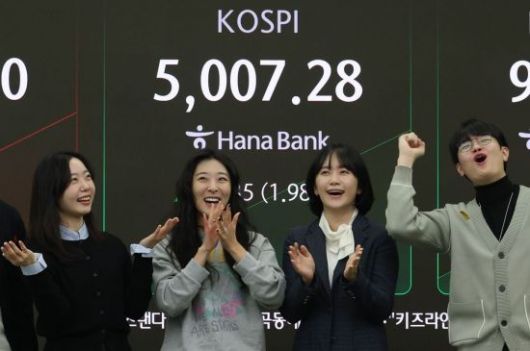 코스피가 꿈의 지수 '5000'을 돌파한 22일 서울 중구 하나은행 딜링룸에서 직원들이 기뻐하며 박수를 치고 있다.