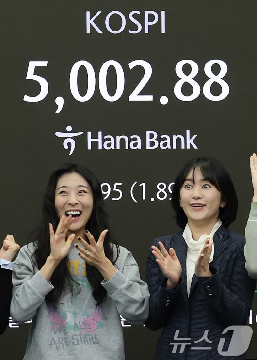 (서울=뉴스1) 박지혜 기자 = 22일 오전 서울 중구 하나은행 본점 딜링룸 현황판에 코스피 지수가 장중 5000p를 넘으며 개장하고 있다. 2026.1.22/뉴스1