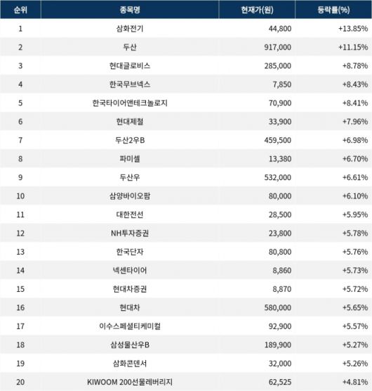 6위 현대제철(004020)은 현재가 3만 3900원으로 7.96% 상승 중이다. 7위 두산2우B(000157)는 현재가 45만 9500원으로 6.98% 상승 중이다. 8위 파미셀(005690)은 현재가 1만 3380원으로 6.70% 상승 중이다. 9위 두산우(000155)는 현재가 53만 2000원으로 6.61% 상승 중이다. 10위 삼양바이오팜(0120G0)은 현재가 8만 원으로 6.10% 상승 중이다.
