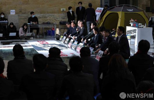 [서울=뉴스핌] 윤창빈 기자 = 송언석 국민의힘 원내대표가 22일 서울 여의도 국회 로텐더홀에서 열린 최고위원회의에서 모두발언을 하고 있다. 2026.01.22 pangbin@newspim.com