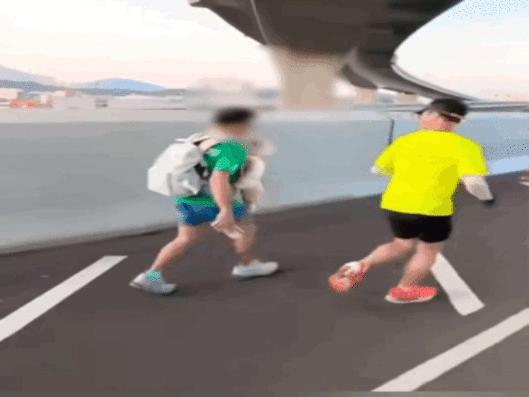 사회관계망서비스(SNS)에 공유된 영상 속 남성은 배낭을 멘 상태에서 한 손에 휴대전화를 들고 달리고 있었으며, 아기에게도 번호표가 부착돼 있었다.