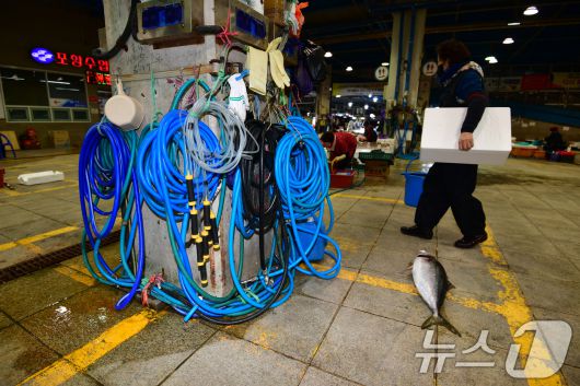 (포항=뉴스1) 최창호 기자 = 22일 경북 포항시 죽도어시장 좌판 상인들이 사용하는 수도호수가 강추위에 얼어 붙은 가운데 한 상인이 장사를 준비하기 위해 걸어가고 있다. 이날 포항지역 아침최저 기온은 영하 9도 체감기온은 영하 11도를 기록했다. 2026.1.22/뉴스1