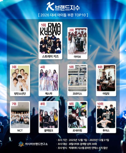 류원선 아시아브랜드연구소 리서치센터장은 "K-브랜드지수 대세 아이돌 부문은 전 세계 대중문화의 중심이 된 K-팝의 현재 주소를 보여주는 지표다. 1위를 차지한 스트레이 키즈를 비롯한 아이브, 에스파 등은 단순한 음악 활동을 넘어, 거대 팬덤(Fandom)을 기반으로 한 강력한 문화적 영향력을 행사하고 있다. 이는 빅데이터상에서 압도적인 언급량과 긍정적인 버즈(Buzz)로 직결되는 중"이라고 분석했다.