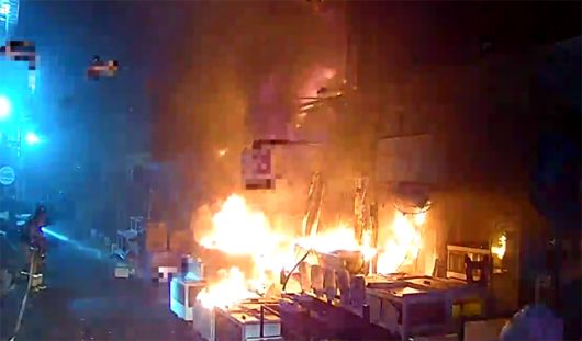 22일 오전 5시 14분 포항시 남구 구룡포읍 구룡포시장 인근 상가에서 화재가 발생해 소방당국이 불을 끄고 있다. /경북소방본부 |