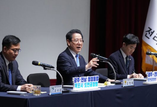 김영록 전라남도지사가 21일 목포시민문화체육센터에서 열린 광주·전남 행정통합 도민공청회에서 주민들의 질문에 답변을 하고 있다.전남도청 |