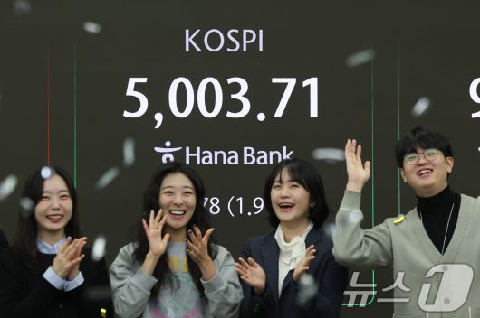 22일 오전 서울 중구 하나은행 본점 딜링룸 현황판에 코스피 지수가 장중 5000p를 넘으며 개장하자 직원들이 환호하고 있다. 2026.1.22/뉴스1 ⓒ News1 박지혜 기자 |