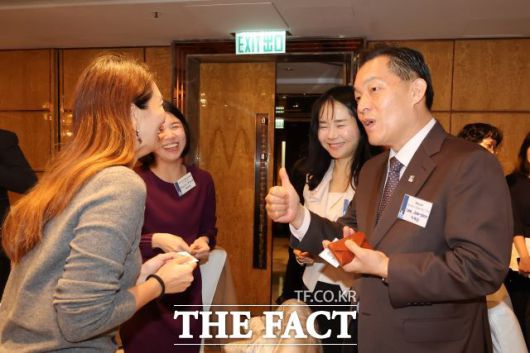 이재준 수원시장이 21일 홍콩 리츠칼튼호텔에서 열린 수원경제자유구역 현지 투자유치설명회에서 참석자들과 대화를 나누고 있다. /수원시 |