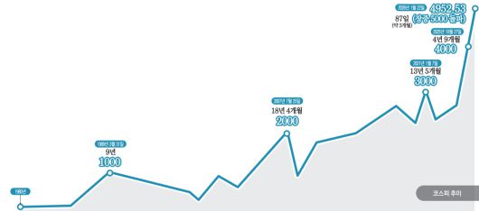 코스피의 역사를 되짚어보면 1000포인트 단위 돌파는 거북이걸음과 같았다. 지수 도입 이후 1000에서 2000에 도달하기까지는 18년 4개월이 소요됐다. 2000에서 3000까지는 13년 5개월이 걸렸다.