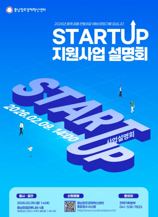 충남창조경제혁신센터가 2026년 창업 지원 사업을 본격 추진한다고 밝혔다. 센터는 2월 9일 사업설명회를 열어 한 해 동안 진행할 창업 지원 사업 전반을 소개할 예정이다.