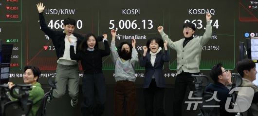 (서울=뉴스1) 박지혜 기자 = 22일 오전 서울 중구 하나은행 본점 딜링룸 현황판에 코스피 지수가 장중 5000p를 넘으며 개장하자 직원들이 환호하고 있다. 2026.1.22/뉴스1