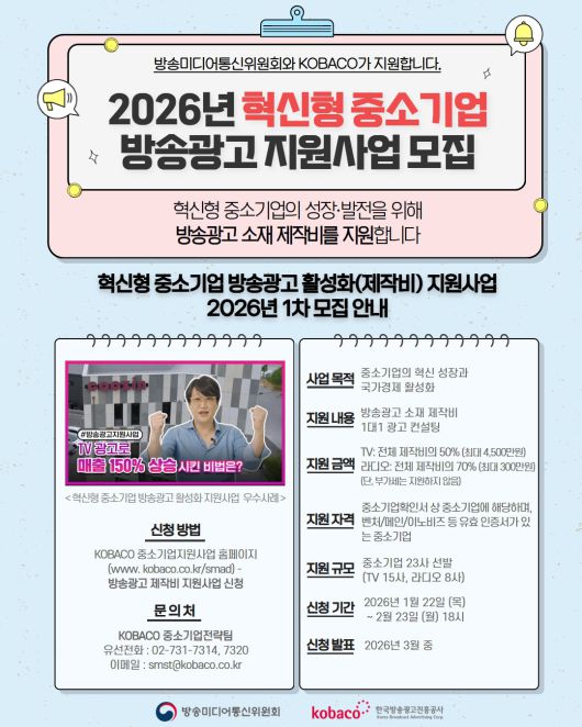 방송미디어통신위원회와 한국방송광고진흥공사(코바코)는 22일 '2026년 중소기업·소상공인 방송광고 제작지원사업' 공개모집을 한 달여간 진행한다고 밝혔다.