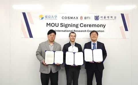 코스맥스는 이날 일본 도쿄에서 서울대학교·일본 도쿄대학교와 글로벌 공동 연구를 위한 3자 연구 협약을 체결했다고 밝혔다. 협약식에는 윤석균 코스맥스비티아이 BI(Bio Innovation) 랩장, 오라시오 카브랄(Horacio Cabral) 도쿄대학교 바이오 엔지니어링학과 교수, 이연 서울대학교 자연과학대학 화학부 교수가 참석했다.
