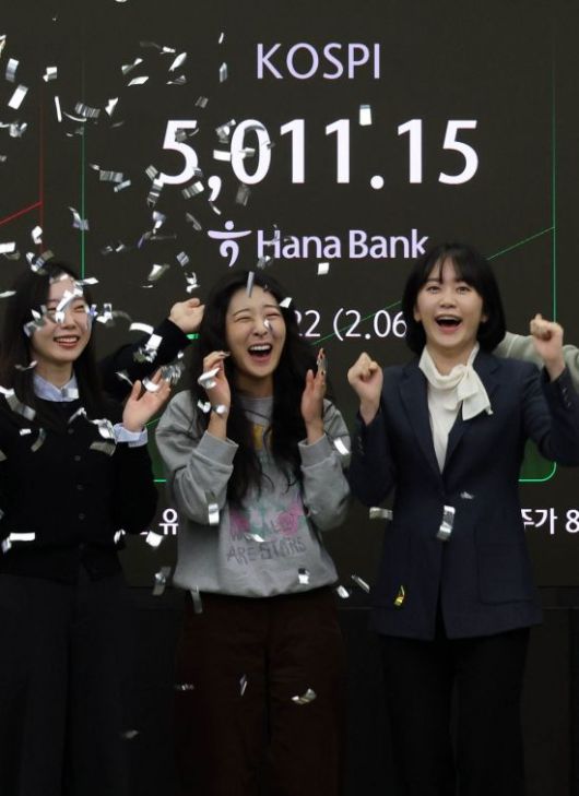코스피가 꿈의 지수 '5000'을 돌파한 22일 서울 중구 하나은행 딜링룸에서 직원들이 기뻐하고 있다.