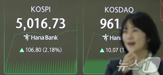(서울=뉴스1) 박지혜 기자 = 22일 오전 서울 중구 하나은행 본점 딜링룸 현황판에 코스피 지수가 장중 5000p를 넘으며 개장하고 있다. 2026.1.22/뉴스1