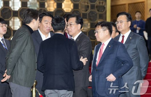 (서울=뉴스1) 이승배 기자 = 송언석 국민의힘 원내대표가 22일 서울 여의도 국회 로텐더홀에서 최고위원회의 참석에 앞서 의원들과 단식중인 장동혁 대표의 상태에 대해 대화하고 있다. 2026.1.22/뉴스1photolee@news1.krCopyright ⓒ 뉴스1. All rights reserved. 무단 전재 및 재배포, AI학습 이용 금지.