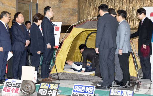 (서울=뉴스1) 이승배 기자 = 송언석 국민의힘 원내대표가 22일 서울 여의도 국회 로텐더홀에서 최고위원회의를 하기에 앞서 단식중인 장동혁 대표의 상태를 확인하고 있다. 2026.1.22/뉴스1photolee@news1.krCopyright ⓒ 뉴스1. All rights reserved. 무단 전재 및 재배포, AI학습 이용 금지.