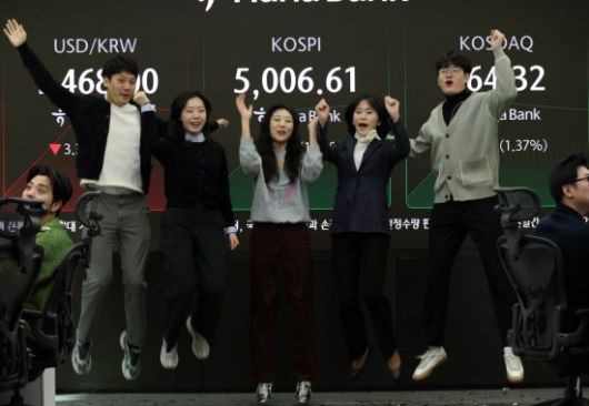 코스피가 꿈의 지수 '5000'을 돌파한 22일 서울 중구 하나은행 딜링룸에서 직원들이 기뻐하며 박수를 치고 있다.