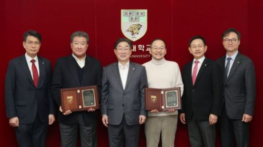 고려대 관계자들이 기부식 종료 후 기념사진을 촬영하고 있다. 고려대의료원은 홍민표 부라더상사 대표이사와 김대중 대공개발 회장으로부터 의과대학 및 필수의료 분야 발전을 위한 기금 2억원을 전달 받았다. 고려대의료원 |