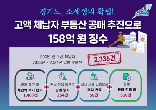 경기도는 지난해 3월부터 11월까지 약 9개월간 고액 체납자를 대상으로 부동산 공매를 추진한 결과, 788명으로부터 총 158억 원을 징수했다고 22일 밝혔다.
