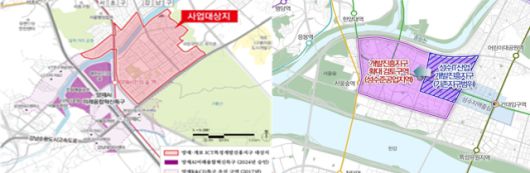 (왼쪽부터) 양재·개포 ICT 특정개발 진흥지구, 성수 IT문화콘텐츠 산업·유통개발진흥지구 위치도 [사진=서울시] |