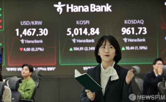 [서울=뉴스핌] 양윤모 기자 = 22일 오전 코스피가 5000 을 돌파하자 서울 중구 하나은행본점 딜링룸에서 직원이 환호하고 있다. 2026.01.22 yym58@newspim.com