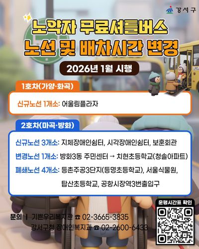 서울 강서구(구청장 진교훈)는 장애인과 어르신 등 교통약자의 이동 편의를 높이기 위해 '노약자 무료셔틀버스' 노선을 정비하고, 변경 운행에 들어갔다고 밝혔다.