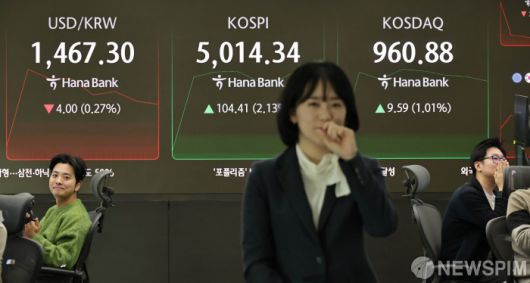 [서울=뉴스핌] 양윤모 기자 = 22일 오전 코스피가 전장 종가보다 104.41 포인트(2.13%) 상승하며 5014.34로, 코스닥은 9.59 포인트(1.01%) 상승한 960.88로 장을 시작한 가운데, 서울 중구 하나은행본점 딜링룸에서 직원들이 업무를 보고 있다. 서울외환시장에서 달러/원 환율은 전장 대비 4.00원 하락한 1467.30원에 주간거래를 시작했다. 한편 이재명 대통령은 더불어민주당 '코스피 5,000 특별위원회' 소속 위원들을 청와대로 초청해 오찬을 함께한다. 2026.01.22 yym58@newspim.com