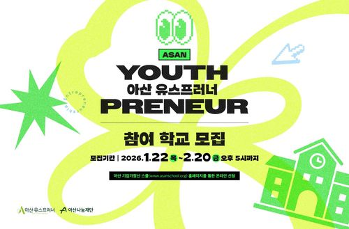 (서울=연합뉴스) 홍규빈 기자 = 아산나눔재단은 청소년 기업가정신 교육 프로그램 '아산 유스프러너'에 참여할 중고등학교 130곳을 다음 달 20일까지 모집한다고 22일 밝혔다.