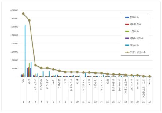 2위 한샘 브랜드는 참여지수 553,070, 미디어지수 586,121, 소통지수 821,384, 커뮤니티지수 534,577, 시장지수 908,588이 되면서 브랜드평판지수 3,403,739로 분석됐다. 지난 12월 브랜드평판지수 2,057,761과 비교하면 65.41% 상승했다.