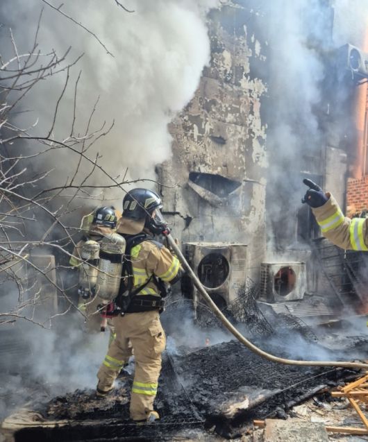 21일 오후 1시 7분쯤 충남 청양군 청양읍 읍내리에 위치한 휴게음식점에서 불이 나 소방대원들이 진압 중인 모습. [사진=청양소방서] 2026.01.22 jongwon3454@newspim.com |