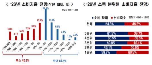 조사에 따르면 응답자의 54.8%는 올 해 소비지출을 지난해 대비 확대할 계획이라고 밝혔다. 소비 계획은 소득수준에 따라 차이를 보였다. 소득 하위 40%(1~2분위)는 소비를 작년에 비해 줄일 것이라 응답했고, 상위 60%(3~5분위)는 올 해 늘릴 것이라고 답했다. 소득 5분위는 전체 가구를 소득 수준에 따라 20%씩 나눈 지표로 숫자가 낮을수록(1분위) 소득이 낮고 높을수록(5분위) 소득이 많다.