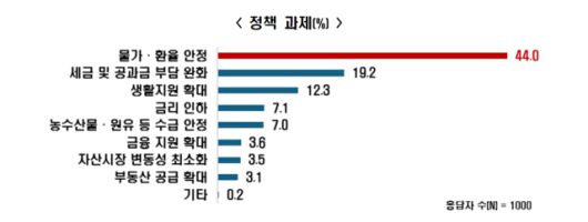 한편 올 해 소비 여력이 부족하다고 응답한 국민들은 △부업?아르바이트(34.0%) △예적금 등 저축 해지(27.4%) 등을 통해 추가 소비 여력을 확보해 나갈 것이라고 했다. 소비 환경 개선을 위한 정책 과제에 대해 국민들은 △물가·환율 안정(44.0%) △세금 및 공과금 부담 완화(19.2%) △생활지원 확대(12.3%) 등을 제시했다.
