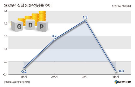 한국은행이 22일 발표한 '2025년 4분기 및 연간 실질 국내총생산(속보)'에 따르면 지난해 4분기 실질 국내총생산(GDP)은 전기 대비 0.3% 감소했다. 전년 동기 대비로는 1.5% 증가했지만, 분기 기준으로는 다시 마이너스 성장으로 돌아섰다.