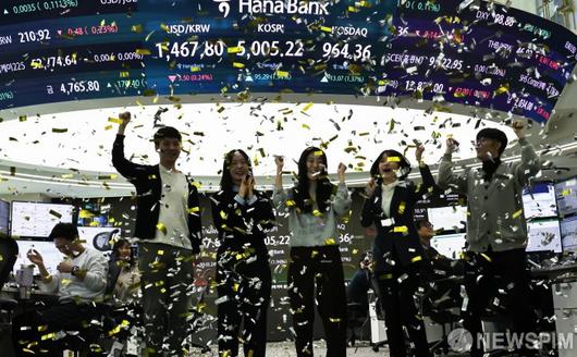 [서울=뉴스핌] 양윤모 기자 = 22일 오전 코스피가  5000 을 돌파하자 서울 중구 하나은행본점 딜링룸에서 직원들이 환호하고 있다.  한편 이재명 대통령은 더불어민주당 '코스피 5,000 특별위원회' 소속 위원들을 청와대로 초청해 오찬을 함께한다. 2026.01.22 yym58@newspim.com