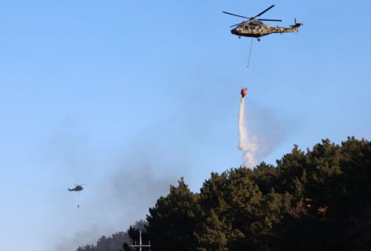 22일 부산소방본부에 따르면 이날 오전 9시 현재 화재 현장의 큰 불길은 잡혔다. 지상에서는 불길이 보이지 않고 곳곳에서 연기만 올라오는 상태다. 현재 17대의 헬기가 투입돼 집중 방수 작업을 펼치고 있다. 소방당국은 헬기 방수가 마무리되면 지상 인력을 통해 잔불 정리 작업을 진행할 예정이다.