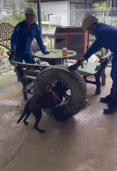 [서울=뉴시스]최현호 기자, 최승혜 인턴 = 말레이시아에서 반려견 한 마리가 버려진 타이어 휠에 머리가 끼었다가 구조된 사연이 전해졌다.