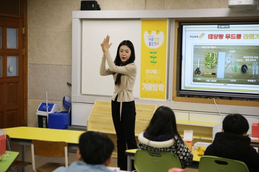 이윤아 연구원은 연양초와 연봉초에서 ‘태양의 빛 에너지’를 주제로 태양전지의 작동 원리와 에너지 전환 과정을 학생 눈높이에 맞춰 설명하고, 태양전지판과 LED 등을 활용해 태양광 무드등 제작 체험을 진행했다.