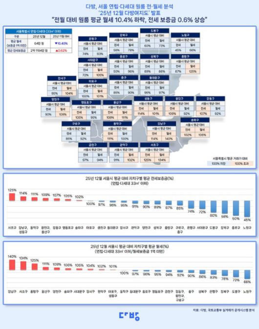다방 관계자는 "겨울철 거래 공백기와 방학 등 계절적 요인으로 일부 집주인이 임대료를 조정했지만, 지역별 월세 격차는 여전하다"고 말했다.