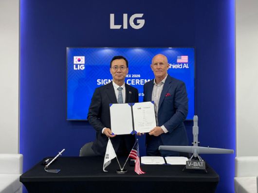 LIG넥스원의 다목적 드론발사 유도탄 'L-MDM'을 쉴드 AI의 수직 이착륙기(V-BAT)에 장착 후 비행·발사 시험하는 사업 계약을 기념하기 위한 행사다.