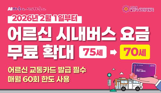 울산시는 ▷2024년 9월 어린이 ▷2025년 7월 75세 이상 ▷2026년 2월 70세 이상으로 시내버스 이용 무료사업을 확대해 시민들의 교통복지 향상과 함께 대중교통 이용 활성화를 꾀하고 있다.