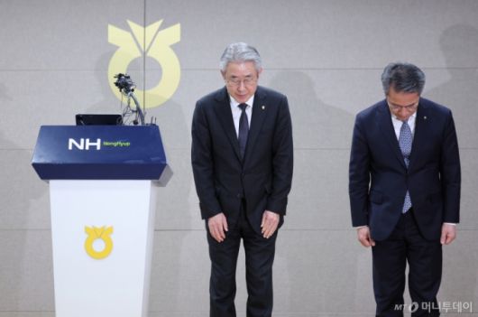 [서울=뉴시스] 김진아 기자 = 강호동 농협중앙회장과 농협 임직원들이 13일 서울 중구 농협중앙회 본관에서 대국민 사과문을 발표하던 중 고개숙여 사과 인사를 하고 있다. 농협중앙회와 농협재단은 임직원 성비위와 업무상 배임을 자체 적발하고도 이를 수사기관에 고발하지 않고, 공금으로 임직원의 형사사건 변호사비를 지원하거나 1박에 200만원이 넘는 출장비를 사용하는 등 내부통제 부실과 방만한 경비 집행 실태가 정부 감사 결과 드러났다. 2025.01.13. bluesoda@newsis.com /사진=김진아 |