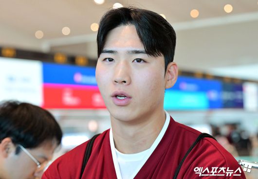 출국 전 키움 이주형이 취재진의 질문에 답하고 있다.