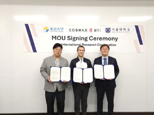 코스맥스는 일본 도쿄에서 서울대학교 및 일본 도쿄대학교와 글로벌 공동 연구를 위한 3자 연구 협약을 체결했다고 22일 밝혔다. 협약식에는 윤석균 코스맥스비티아이 BI(Bio Innovation) 랩장, 오라시오 카브랄(Horacio Cabral) 도쿄대학교 바이오 엔지니어링학과 교수, 이연 서울대학교 자연과학대학 화학부 교수가 참석했다.