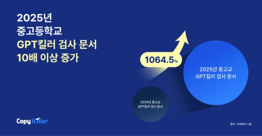 같은 기간 중·고등학교에 도입된 AI 기반 표절검사 솔루션 '카피킬러 스쿨'의 전체 표절검사 문서 수는 175.6% 증가했다. 카피킬러 스쿨에 탑재된 GPT킬러 기능은 이용 문서 수가 1064.5% 늘어 전체 증가율을 크게 웃돌았다. 주요 자사고 및 특목고에서 카피킬러 스쿨을 도입해 활용 중이며, 일부 지자체 교육청은 자체 교육 플랫폼에 표절 검사 및 GPT킬러 기능을 연동해 서·논술형 평가 대비 시스템을 구축하고 있다.