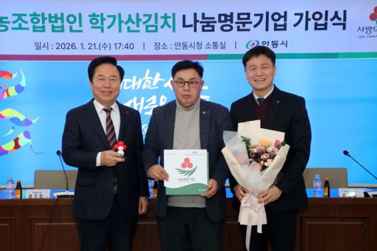 [안동=뉴시스] 영농조합법인 안동학가산 마깎두기김치(대표 우국한)의 나눔명문기업 가입식이 열리고 있다. (사진=안동시 제공) 2026.01.22. photo@newsis.com *재판매 및 DB 금지 |