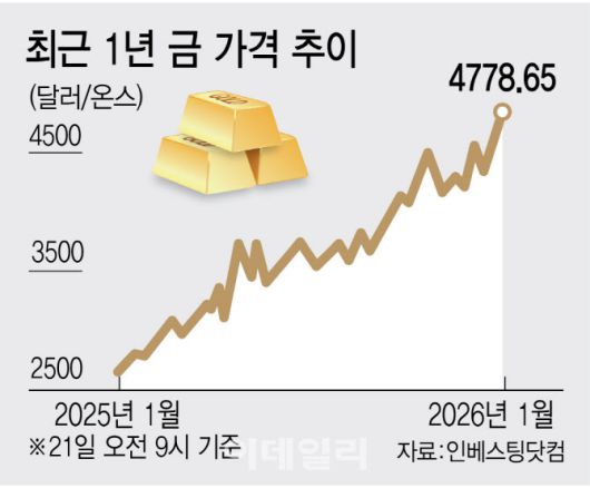 금값은 불과 석달 전까지만 해도 도달 불가능하다고 여겨졌던 온스당 4000달러를 돌파한 데 이어 이제 온스당 5000달러(약 733만원)에 근접하고 있다. 이날 금 선물 가격은 전거래일대비 1.5% 상승한 온스당 4831.80달러(약 709만원)로 사상 최고가를 또 경신했다. 금값은 이달 들어서만 온스당 500달러 이상 상승했으며, 지난 20일 하루 만에 171.20달러 급등했다.